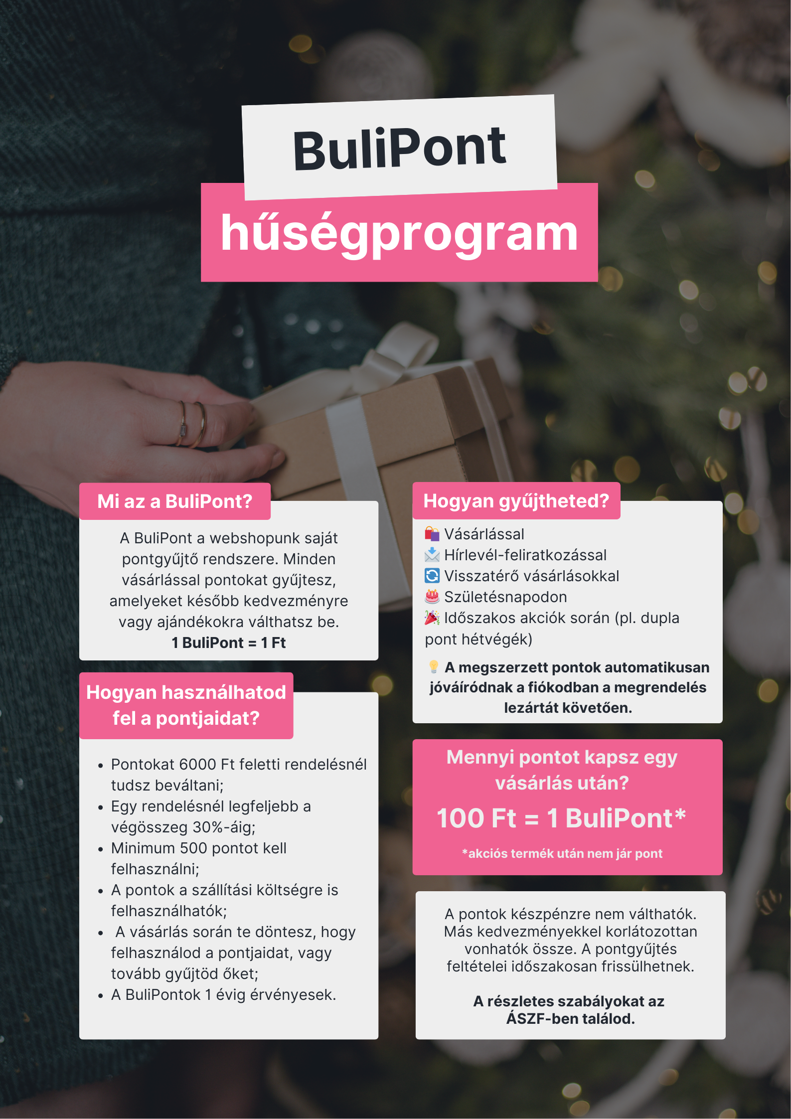 A Szolgáltató a vásárlói lojalitás erősítése érdekében BuliPont néven hűségprogramot működtet. A hűségprogram keretében a regisztrált vásárlók meghatározott feltételek teljesítése esetén pontokat gyűjthetnek, amelyeket későbbi vásárlásaik során kedvezményként vagy ajándékokra válthatnak be.
