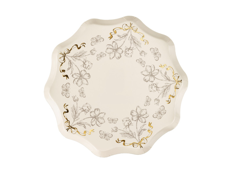- 6 db virágos bézs papír tányér arany részletekkel,